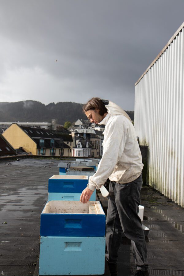 Selv startet han med birøkting for femten år siden, så da han flyttet til Bergen tre år senere, tok han med seg både interessen og virket. Nå har han totalt tjuefem bikuber rundt om i Bergen, i hager i Sandviken, næringsbygg i Fyllingsdalen, hotelltak ved Bryggen, i skogen på Fløyen og såklart på toppen av Grieghallen.