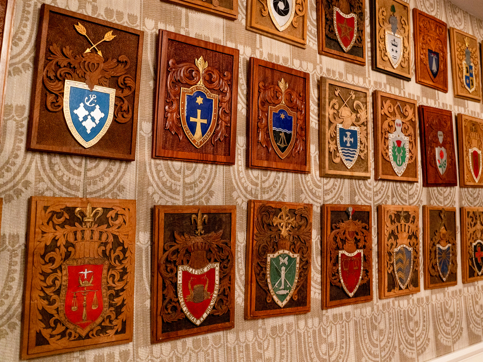Det første rommet vi får se, er en stor spisesal. Her samles brødrene til felles taffel etter møtene – et såkalt brodermåltid, forteller Hannevold. To av veggene er fullstendig dekket av ridderinspirerte våpenskjold, mens langsiden domineres av tre store portretter. De avbilder de nåværende lederne for underlosjene og selveste provincialmesteren, sjefen for provinsen.